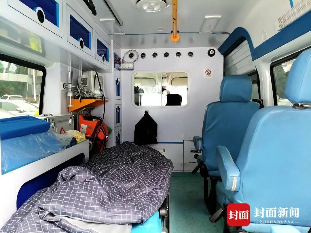 封面新闻记者在现场看到,这辆车的后窗玻璃贴了颜色较深的车窗膜,从外部无法看清内部情况。记者打开车辆后门,发现内部右侧设有3个独立的座位,中间摆放着一台可折叠的推车式病床,左侧设有冷藏设备和装载小型医疗器械和药品柜子,还配备有供氧仪及心电监护仪等医疗设备。