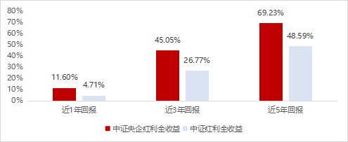 从中长期维度看,无论是近一年、近三年还是近五年,计入分红再投资的中证央企红利全收益指数相较中证红利全收益指数都更为出彩。