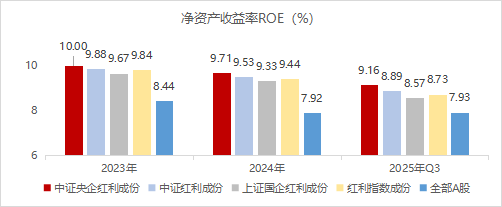 数据显示,2023年至2025年三季度,央企红利指数成份股的平均净资产收益率(ROE)与净利润水平,持续高于A股整体与部分主流红利类指数,盈利状况的持续改善,有望为可持续的经营与股东回报带来“源头活水”。
