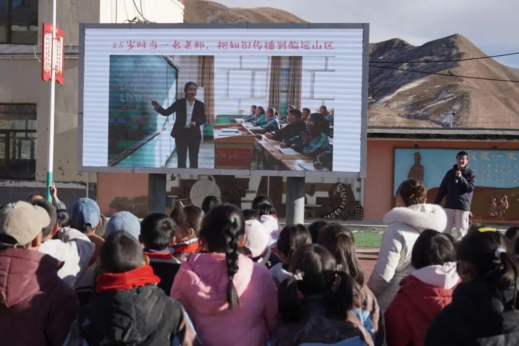 在湟源县日月中心学校的操场上,一场特殊的“放映会”正在进行。人群中,孩子们爆发出阵阵惊呼和兴奋的议论,他们指着屏幕,认出了十几年后那个既陌生又熟悉的自己,也认出了身边的伙伴。