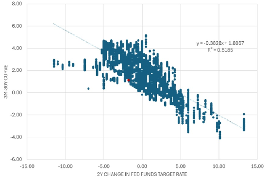 当然,评估长债收益率相对于现金的吸引力时不能脱离政策背景。曲线在政策宽松时通常非常陡,在政策紧缩时则趋平或倒挂。变化速度也很关键。众所周知,曲线在美联储降息时趋于变陡,长债与现金之间的利差也不例外。从1977年算起,以过去两年的降息幅度来看,现金与30年期收益率的区间陡度仍然处于极低水平。