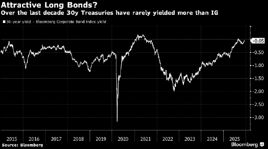 诚然,许多企业的财务状况比联邦政府还健康。但从过去十年的标准来看,长债相对于信用市场其他证券的确便宜得多。自1990年以来,30年期国债收益率从未比投资级债券指数收益高出70个基点以上,因此当长债收益率相对企业债有溢价时,投资者可能会更愿意买入,无论预算赤字如何。