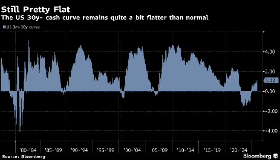话虽如此,长债相对于现金和现金等价物可一点也不便宜,而且是恰恰相反!今年短端收益率下降而长端没有,使得3个月至30年期收益率曲线最近有所变陡,但从历史角度看这点陡度根本不算什么。