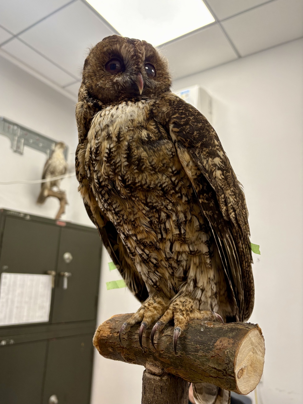 他表示,标本保存年限与材料新鲜度密切相关,因此他将灰林鸮带回家后第一时间进行制作。选择将标本转交复旦大学祖嘉生物博物馆,是因为馆内具备良好的保存条件,适宜的湿度控制、避光防腐措施,能更长久地保存标本;同时,这里也是一个重要的展示平台,能让更多人了解这只鸟的故事。