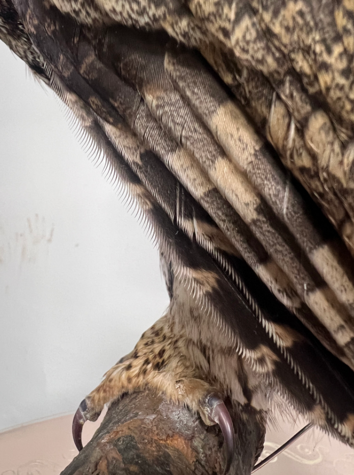 乍一看,这只灰林鸮仿佛还活着——双目圆睁,屹立于树桩之上,羽毛光亮而柔软。