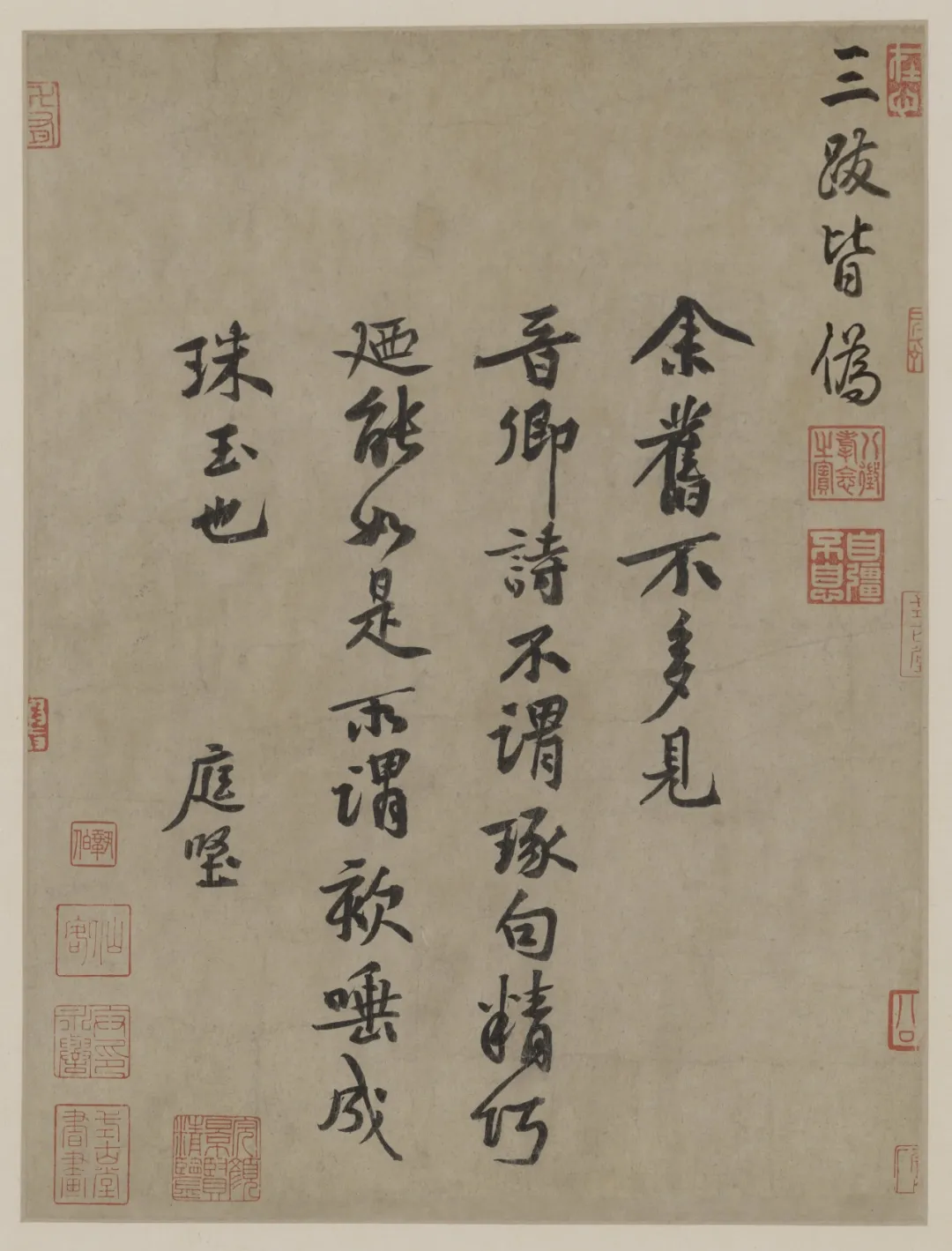 元祐元年(1086),黄庭坚与苏轼皆曾为王诜自书诗词卷作跋,字里行间透露出对王诜诗情的由衷钦佩。此作为不可多得的黄庭坚早期行楷书墨迹。整体观之,中规中矩,几乎不见其他作品中的欹侧、纵横、飞动之势。但细观之,不难看出黄书的显著特征,结体严紧,中宫紧收,字间紧密,行间宽绰。