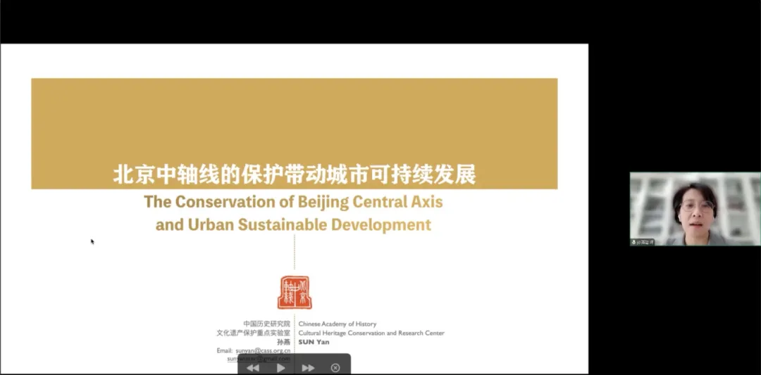 中国历史研究院科技考古与文化遗产保护重点实验室副研究员孙燕在视频发言《北京中轴线的保护带动城市可持续发展》中系统梳理了北京中轴线在申遗过程中与成功列入后开展的遗产保护与管理工作,从遗产整体规划管理体系、价值展示与传播体系、公众参与机制等角度,介绍遗产地保护管理措施与实施成效,分析与阐述文化遗产保护对北京老城可持续发展的带动与促进作用。