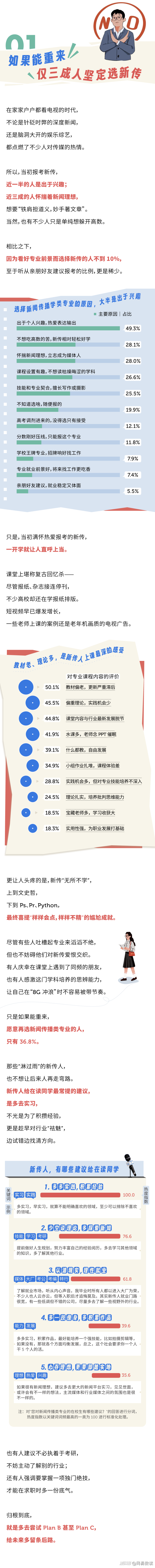 这份对专业的复杂感情,也体现在我们的调查中。求职时,六成人认可新传专业背景带来的文字功底和表达优势,把它当作加分项,但与此同时,近一半人又因为专业壁垒弱、易被替代而视其为减分项。如果能重来,只有 36.8% 的人还会坚定选择这个专业。
