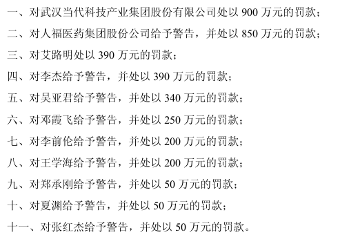对案涉人员:时任人福医药董事长李杰,人福医药董事王雪海,人福医药董事、总裁邓霞飞,人福医药监事郑承刚,人福医药职工监事夏渊,人福医药财务总监吴亚君,人福医药副总裁张红杰,人福医药董事会秘书李前伦给予了警告及相应罚款,总计罚款3670万元。