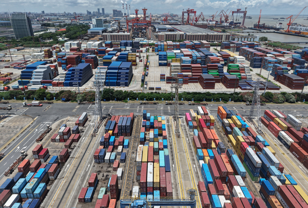2025年8月12日,上海港外贸集装箱码头繁忙作业。视觉中国 图