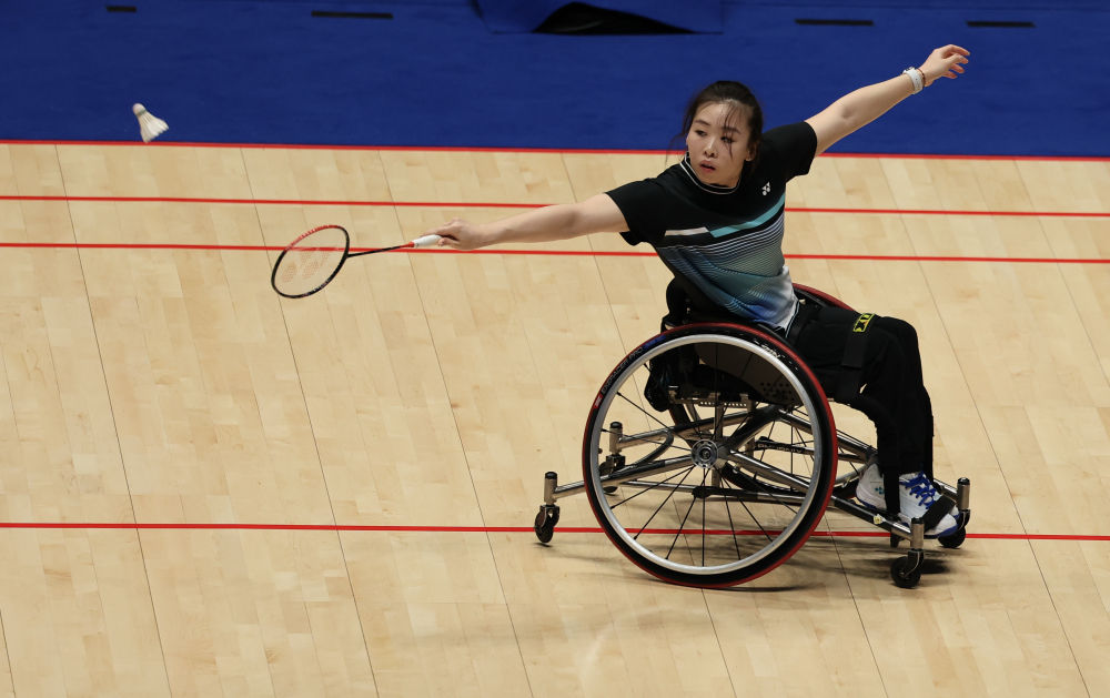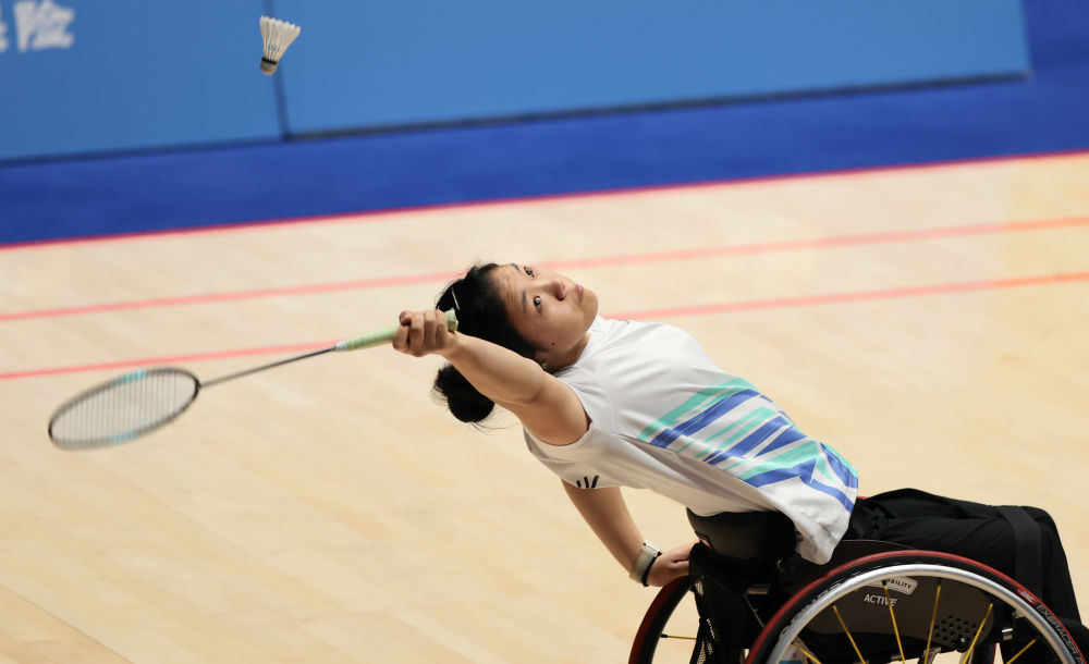 12月12日,重庆队选手樊朝月在比赛中。在羽毛球WH1女子单打比赛中,樊朝月以2比0战胜山东队选手刘家墨。新华社记者 毛思倩 摄