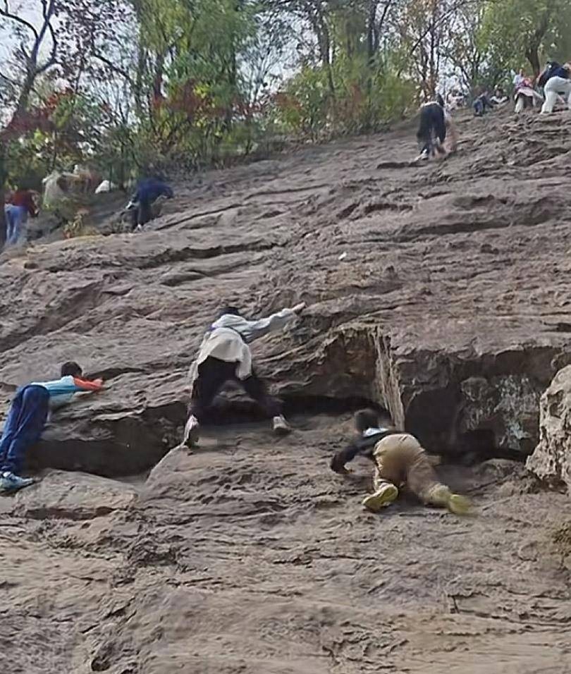 不过,从网上发布的视频和图片可以看到,这处野爬路线存在很大的安全隐患。“最陡峭的路段倾斜度接近 70 度,脚下的碎石松散易滑,每一步都需要格外小心。”有网友称,他注意到,攀爬此处的人几乎都没有携带防护装备,一旦失足,极有可能从数十米长的陡坡滚落。记者也从网友发布的视频中看到,很多家长带着孩子来这里攀爬挑战。“非常陡的坡,自己爬就够离谱的,让孩子也爬,真不知道怎么想的!”有网友称,下面立了不准攀爬的牌子,喇叭也在喊,好多小孩子依旧去爬,没有任何防护措施也没有抓手的地方。记者注意到,在网友指出此举存在风险的同时,有回帖称,“小孩灵活得很,大人能爬上去小孩肯定可以!”