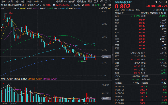 热门ETF方面,同类规模最大的金融科技ETF(159851)全天逆市冲高,场内一度上探1.76%,收盘仍逆市上扬0.75%收复年线。全天放量成交超4亿元,盘中频现溢价,显示买盘资金较为活跃。