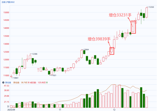 今日增仓上破对应的持仓增量,较近三次(如11月28日、12月10日)明显偏少。由于价格处于更高位置继续上冲通常需要更大的量仓配合,因此这一微观变化值得关注。后续应紧盯沪银冲高过程中的量仓表现,若增仓持续放缓,则对高位沪银需保持一分警惕。