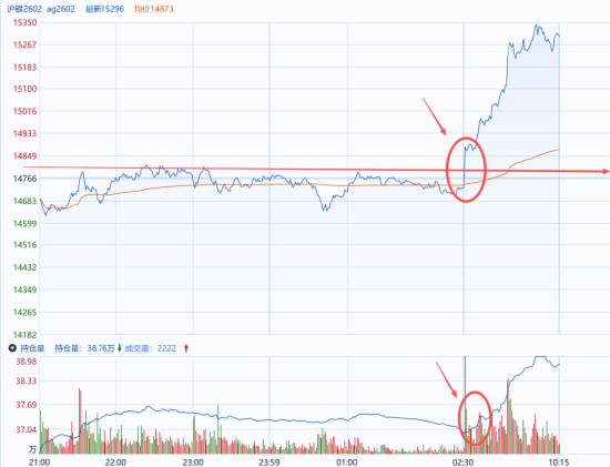 沪银主力2602合约在连续多日高位减仓调整后,今日持仓重新出现拐头向上,多头资金回补,推升完成上方拐点突破。目前12月15日收盘价14793附近,也已由先前的压力位变成支撑位,短期在未失守前,沪银技术上的上升趋势或有望延续,震荡偏强。