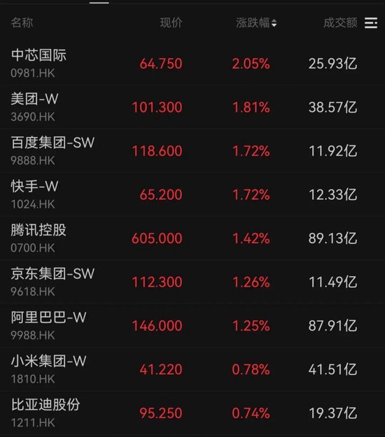 大型科技股普遍回暖,美团、百度、快手、腾讯等分别上涨1.81%、1.72%、1.72%、1.42%。
