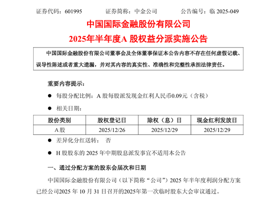 此外,(601995.SH)公告称,公司2025年半年度利润分配方案已经2025年第一次临时股东大会审议通过。以总股本48.27亿股为基数,每股派发现金红利人民币0.09元(含税),共计派发现金红利人民币4.34亿元(含税)。股权登记日为2025年12月26日,除权(息)日和现金红利发放日均为2025年12月29日。H股股东的2025年中期股息派发事宜不适用本公告。