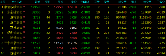 2025年12月24日,国内期货主力合约多数上涨。广期所铂、钯均封涨停板,沪银涨超8%,涨近6%,涨超4%,(EG)涨近4%。跌幅方面,(欧线)、多晶硅跌超1%,跌近1%。