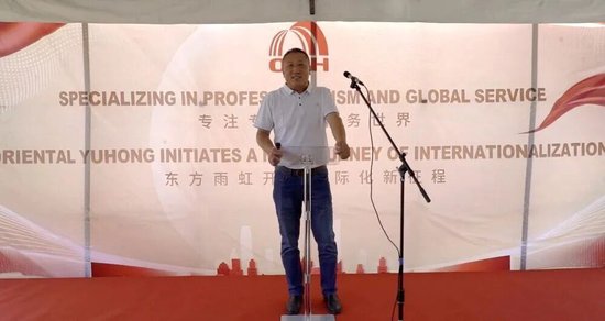 当地时间2024年8月9日上午,东方雨虹控股副董事长刘斌在休斯敦生产研发物流基地奠基仪式致辞。