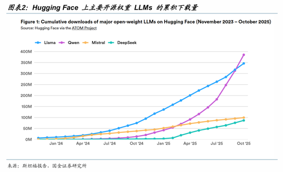 12月16日斯坦福大学发布研究报告指出,在能力与采用率方面,中国的AI模型尤其是开放权重的大语言模型,已接近甚至部分领先于国际先进水平。2025年9 月,阿里巴巴的Qwen 模型家族超越Llama,成为Hugging Face 上下载量最多的 LLM 家族。2024 年 8 月至 2025 年8月期间,中国开源模型开发者占 Hugging Face 所有下载量的 17.1%,略超过美国开发者,后者占下载量的 15.8%。自 2025 年 1 月起,基于阿里巴巴和 DeepSeek发布的开源模型的上传衍生模型已超过基于美国和欧洲主要模型的衍生模型。并且在2025年9月,中国微调或衍生模型占 Hugging Face 上发布的所有新微调或衍生模型的63%。