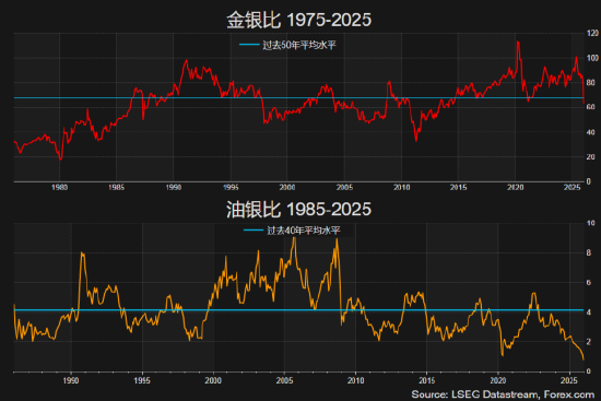 从不同资产价格对比来看,目前金银比略低于长期平均水平,这说明银价已经不再被低估。而油银比则处于过去40年的最低水平,若银价展开温和调整,油价则有更大的上行空间。
