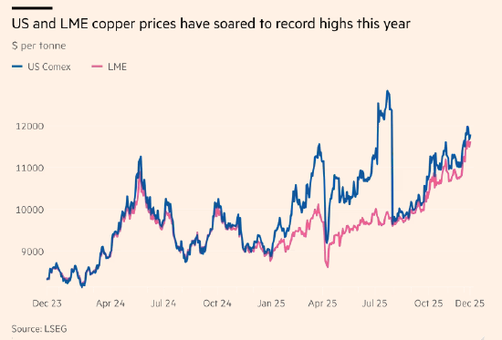 受美国关税、供应中断以及对全球短缺的担忧推动,年末铜价出现疯狂上涨,铜正迎来十多年来最大的年度价格涨幅。