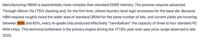 每一片被分配用于生产HBM4的12英寸晶圆,本质上就是从全球DRAM供应池中抽走了三片用于生产PC或手机内存的晶圆。