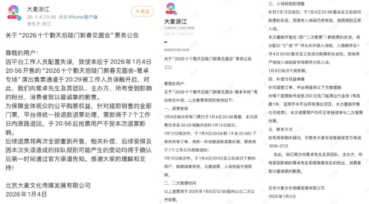 大麦网浙江站官方微博“大麦浙江”在1月4日23点36分发布了关于“2026十个勤天后陡门新春见面会”的票务公告。公告称,因平台工作人员配置失误,致使本应于2026年 1月4日20:56开售的“2026十个勤天后陡门新春见面会-鹭卓专场”演出售票通道于20:29被工作人员误触开启,为保障全体观众的公平购票权益,针对提前销售的全部门票,平台将统一按退款退票处理,票款将于7个工作日内原路退回。于20:56后抢票用户不受本次退票影响,后续退票将再次全部重新开售。