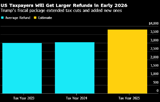 特朗普的立法延长了所得税减免,并新增了对小费和加班工资的免税安排。税收基金会称,退税平均将比通常年份多300美元至1000美元。总体而言,集团的经济学家预计,上半年消费者将获得1000亿美元的额外退税;花旗集团的估算为300亿美元至500亿美元。