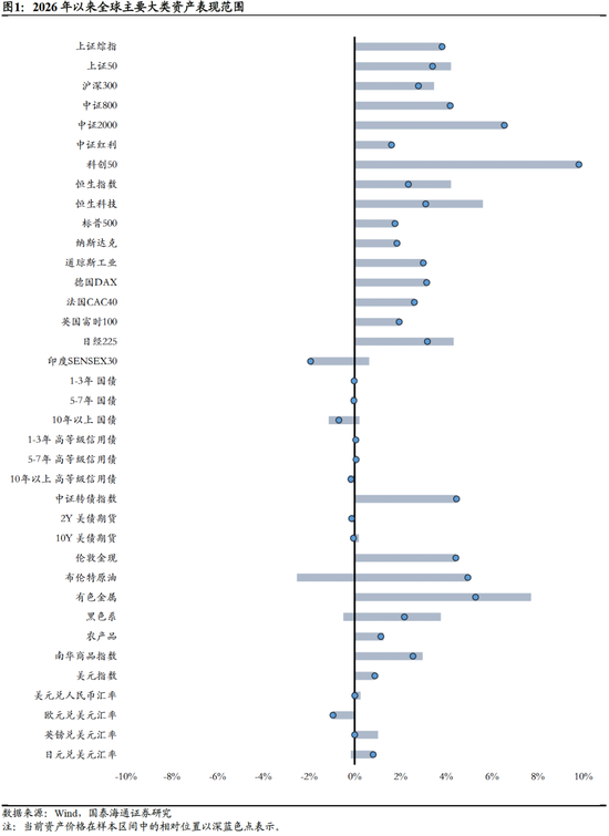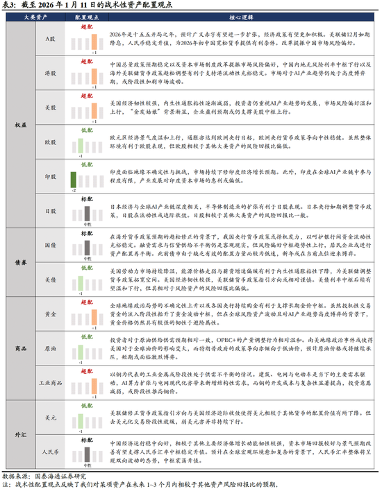 我们以周报的形式回顾上周(2026年1月5日至2026年1月11日,下文同)周内市场关注度高、对大类资产影响较大的事件或数据,并进行必要点评,同时及时更新我们的战术性主动配置观点。战术性配置观点反映了我们对某项资产在未来1~3个月内相较于其他资产风险回报比的预期。