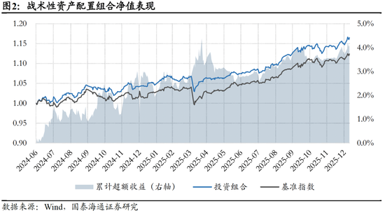 上周,战术性资产配置组合收益率为1.59%。截至2026年1月11日,相对于基准组合,战术性资产配置组合实现累计超额收益率4.10%,累计绝对收益率16.48%。