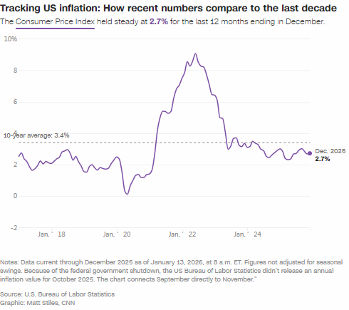 劳工统计局的数据显示,2025 年年末,美国通胀率仍高于正常水平,但全年最终的消费者价格指数数据也表明通胀管控取得一定进展:12 月整体通胀率和核心通胀率均为 2.7%,分别低于 1 月的 3% 和 3.3%。