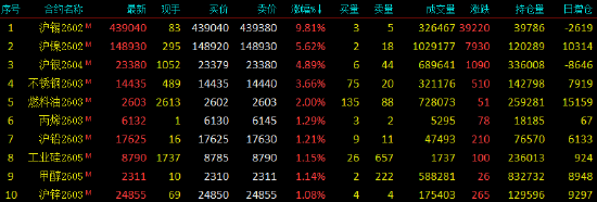 2026年1月15日,早盘开盘,国内期货主力合约涨跌互现,涨超9%,涨超5%,沪银涨超4%,(SS)、涨超3%,SC、(LU)、丙烯、聚丙烯、、涨超1%。跌幅方面,钯跌超4%,铂跌超3%,油、、跌超1%。