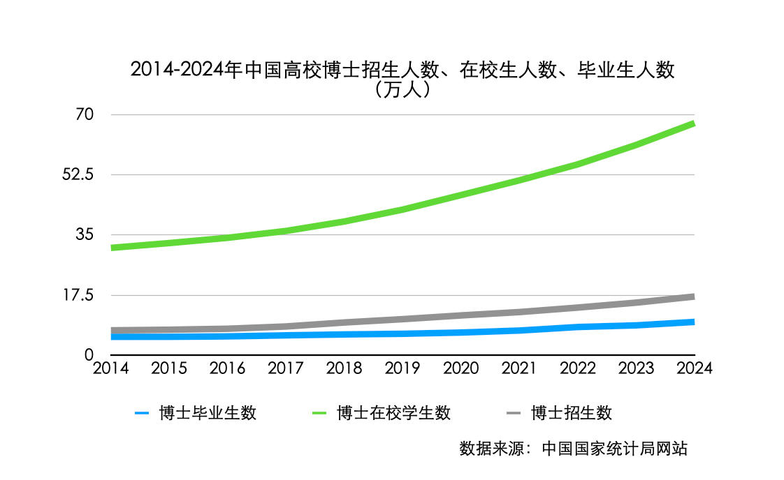 而在中国和印度等国家,《文章》提到,博士生数量则是“爆炸式增长”。界面新闻查阅发现,据中国国家统计局数据,2014至2024年期间,我国博士的招生人数从约7.26万人增长至约17.11万人,涨幅约为135.67%。而博士在校学生人数从2014年的约31.27万人,增至2024年的67.63万人,涨幅约为116.28%。此外,博士毕业生人数从2014年的约5.37万人,增长至2024年的约9.72万人,涨幅约为81%。