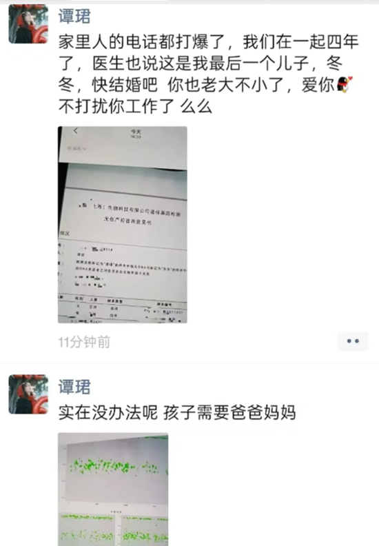 报告显示,她对标注为“东东”的样本进行了亲子鉴定。在她发布的朋友圈截图中,语气急切地喊话:“冬冬,快结婚吧,你也老大不小了。”