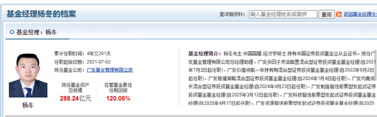 杨冬是广发基金总经理王凡的助理,拥有19年证券从业经验(16年投资管理经验),管理9只公募基金,总规模288.24亿元,以“主观+量化+AI增强”多策略投资体系为核心,2025年管理的5只基金超额收益均超20%。