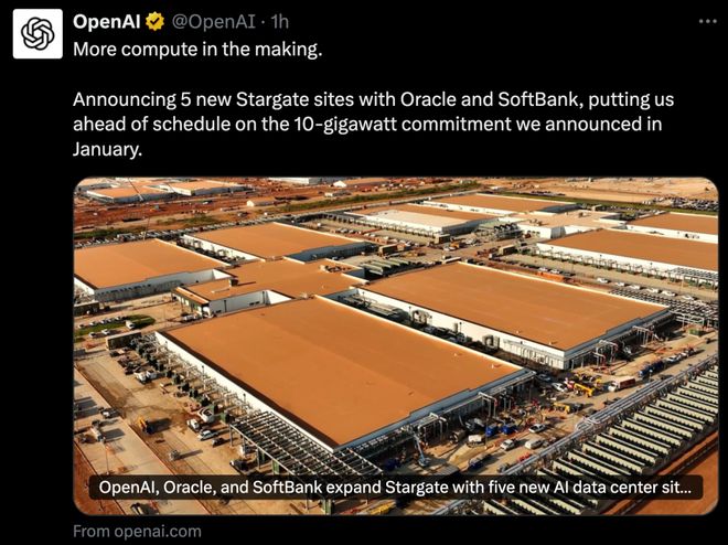 去年9月,OpenAI公布了五个新站点,要在未来三年,实现7GW算力规模。