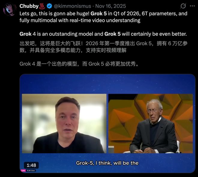 此前,在一期采访中,马斯克还表示Grok 5拥有高达6万亿参数,而且智能密度更高,预计将在上半年发布。