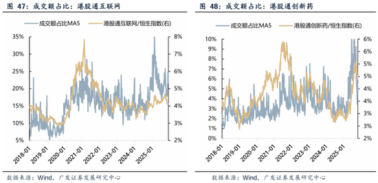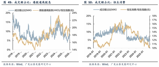 港股通互联网、港股通创新药、港股通高股息、恒生消费的成交额占比(MA5)分别为25.7%、5.7%、5.7%、4.2%。