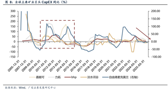 矿业巨头资本开支与金属价格周期出现明显错配。上一轮超级商品周期中,金属价格于2011-2012年达到周期峰值,同期全球矿业巨头资本开支增速达到高点。2020-2022年新能源周期带动金属价格阶段上涨的过程中,巨头的资本开支增速也出现了一定程度的回暖,对比当前资本开支已经连续出现几年的增速放缓阶段,因此我们认为金属的行情未达峰值。