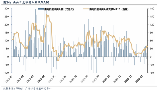 南向资金本周保持净流入。本周(1月12日—1月16日)南向资金净流入额185.29亿港元,上周为净流入294.59亿港元。个股层面,南向资金净买入额排名靠前的个股包括腾讯控股(净买入77.29亿港元),快手-W(净买入34.12亿港元),小米集团-W(净买入32.75亿港元);净卖出额排名靠前的个股包括盈富基金(净卖出62.84亿港元),(净卖出56.56亿港元),恒生中国企业指数ETF(净卖出28.78亿港元)。
