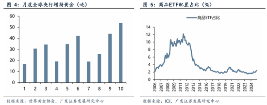 债务高企与地缘格局重塑推动实物资产配置。去美元化背景下,大宗商品成为主权国家对冲信用贬值和囤积战略物资的首选,商品金融属性正在重构。目前,各国央行持续增持黄金,而商品ETF的配置占比仍有提升空间。