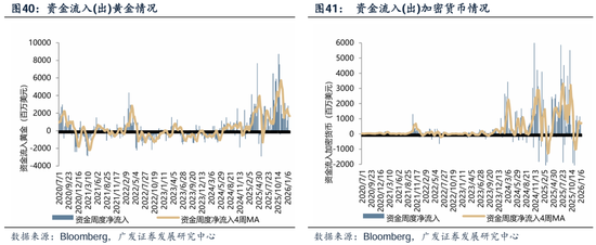 本周黄金市场资金流入增加、加密货币市场资金流入收敛。截至本周三(1月7日—1月14日),资金净流入黄金28.32亿美元,相比上周流入11.98亿美元增加。加密货币资产周度资金净流入7.19亿美元,相比上周流入11.56亿美元收敛。
