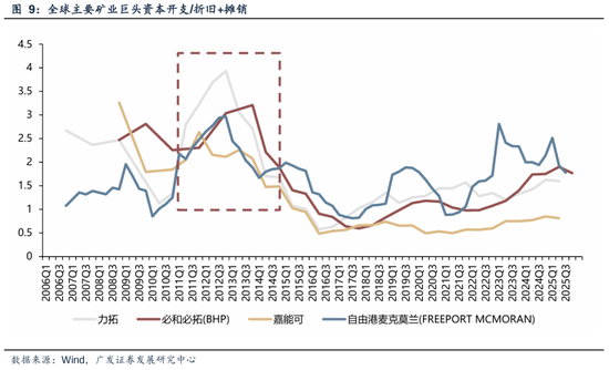 进一步地,资本开支/折旧+摊销可以用来区分“维持性开支”和“增长性开支”。当前的断档主要是因为过去几年增长性开支较低,随着全球经济复苏,补库存周期启动,全球矿业巨头预计增加增长性开支,这能够进一步支撑周期上行的逻辑。