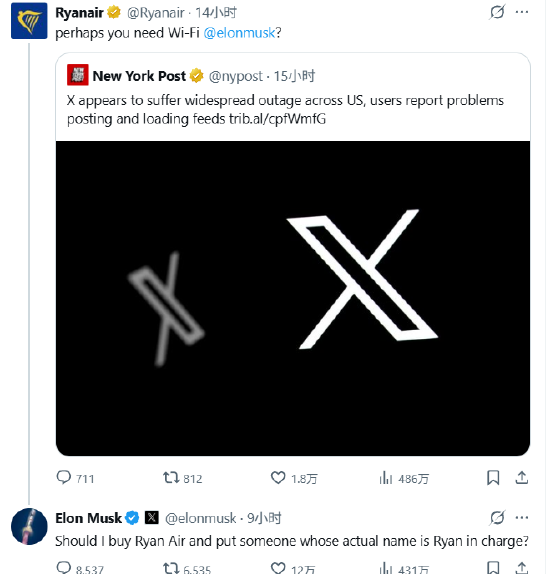 当地时间周五,有报道称X在美国出现大范围故障。瑞安航空的X账号挑衅地询问马斯克:“或许你需要Wi-Fi?”马斯克回应称:“我是不是应该收购瑞安航空,并让一个名叫瑞安的人来管理呢?”
