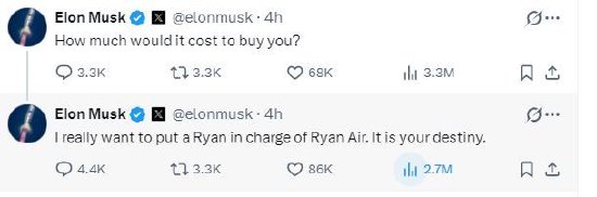 当地时间周日,在发起最新“民调”之前,马斯克连发两贴称:“要买下你需要花费多少钱?”“我真的希望让瑞安来管理瑞安航空公司。这是你的宿命所在。”