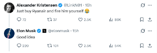 有网友随后在帖子下评论称,“收购瑞安航空,然后你自己解雇他。”对此,马斯克回复称,“好主意!”