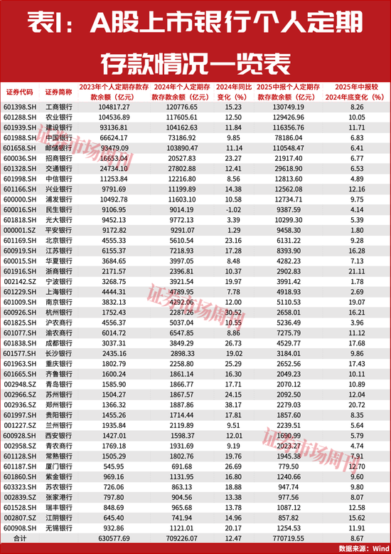 尽管存款利率持续走低,2024年上市银行的个人定期存款余额依然同比增长了12.47%,2025年上半年较2024年底同比增长了8.6%(见表1)。