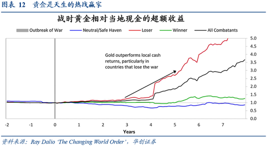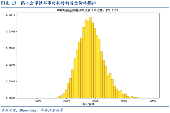 当地缘冲突升级为全球性军事对抗时,我们假设全球债务规模以每年10%的速度增长,且新增的债务通过货币化的手段来实现,意味着10年间全球将增发91.5万亿美元的货币。考虑到冲突升级情境下信用货币一定程度上失效,我们假设新增的货币化的债务最终以黄金进行偿付,意味着新增的91.5万亿美元债务或将以目前21万吨黄金来进行支撑,相当于每盎司黄金支撑1.4万美元债务。