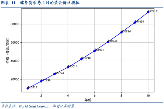 模型的测算思路是,线性推断下十年的时间全球央行的购金需求将增加3万吨,意味着每年有着3000吨的央行购金需求,因此将每年带来约2000吨的黄金缺口,通过供需平衡方程最终带来黄金价格的持续上涨,10年后黄金价格或将达到9.3万美元/盎司。
